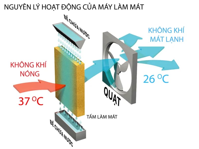 Quạt điều hòa là thiết bị hoạt động dựa trên nguyên lý bay hơi nước để giảm nhiệt độ môi trường. Khác với điều hòa dùng gas làm lạnh sâu, thiết bị này tạo ra luồng gió mát tự nhiên bằng cách làm giảm nhiệt không khí trước khi thổi ra ngoài.